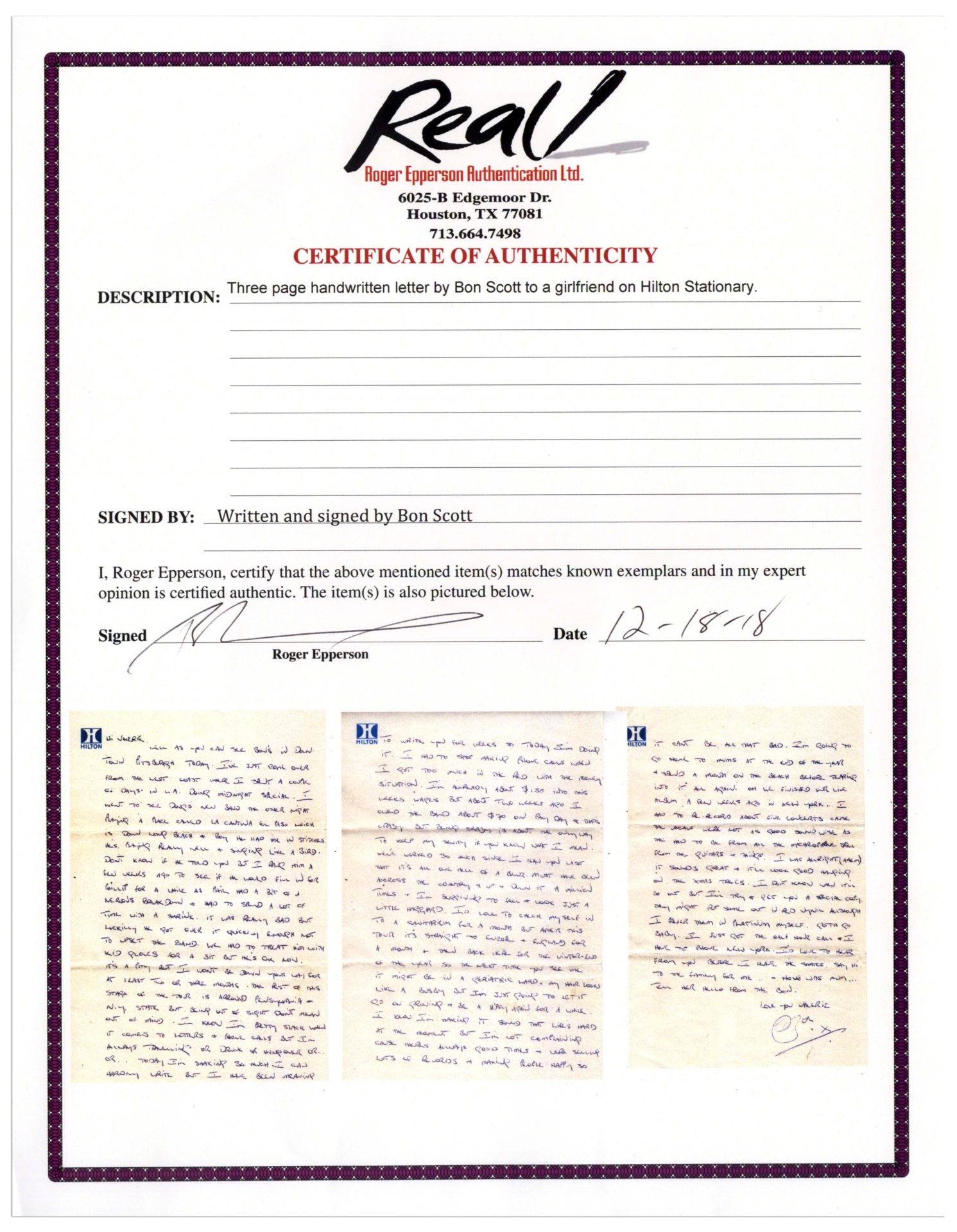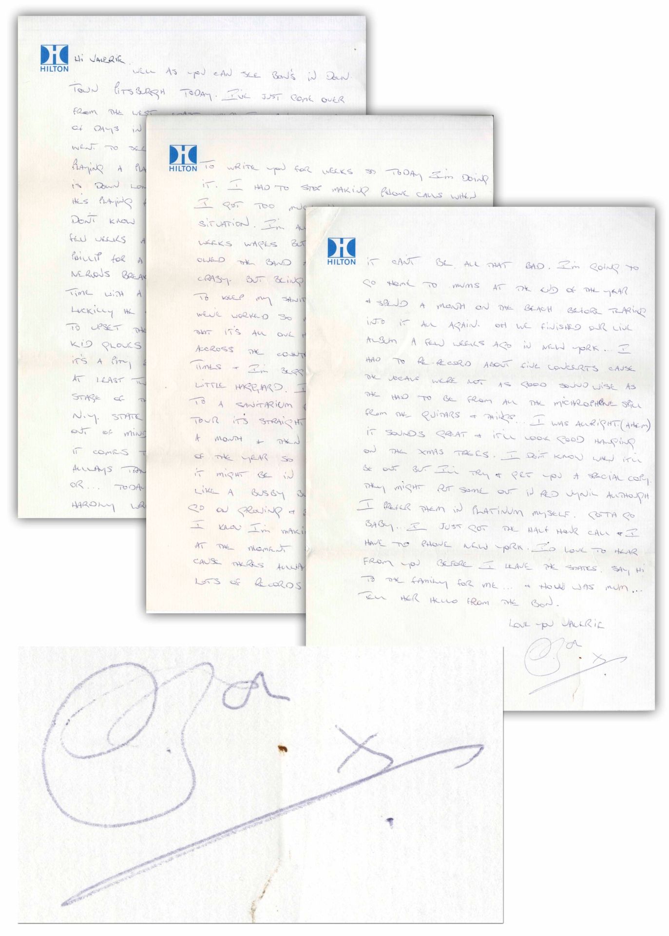 Bon scrisse questa lettera a sua sorella Valerie durante la tappa di Pittsburgh, in Pennsylvania, del tour americano organizzato per promuovere il quinto LP della band, Powerage. In queste tre pagine il cantante racconta molte cose, dall’esibizione della band nel celebre show televisivo The Midnight Special, fino alla registrazione del live If You Want Blood (You’ve Got It), ai problemi mentali del batterista Phil Rudd, e allo stesso tour in corso in quei giorni.
