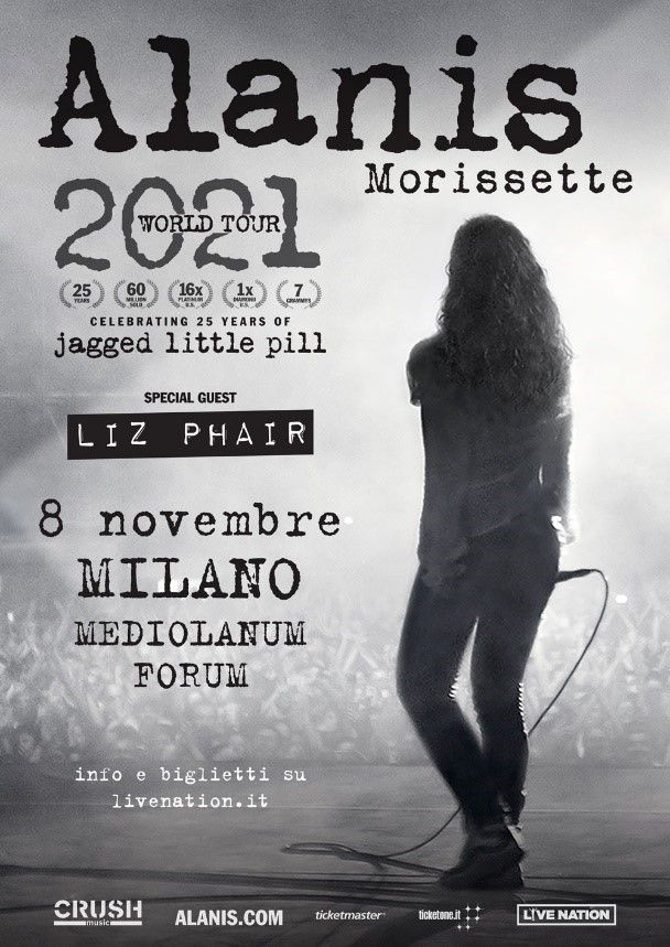 Alanis Morissette ha annunciato il posticipo del tour europeo al prossimo anno a causa dell’emergenza epidemiologica scaturita dal virus Covid-19. La data italiana del tour celebrativo per i 25 anni dall’uscita dell’album “Jagged Little Pill“, originariamente prevista per il 15 ottobre 2020, è riprogrammata all’8 novembre 2021 sempre al Mediolanum Forum di Milano.
