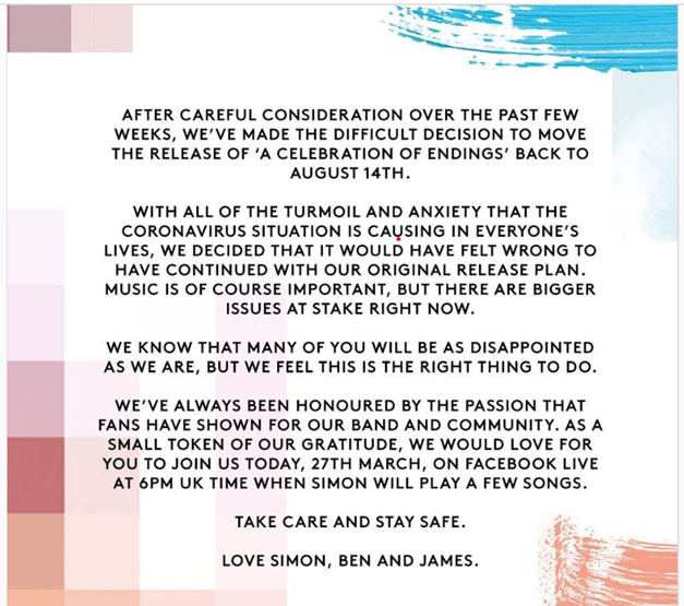 “A Celebration Of Endings” verrà rilasciato il prossimo 14 agosto invece che il 15 maggio come inizialmente previsto. “Con tutto il tumulto e l’ansia che la situazione del coronavirus sta provocando alla vita di tutti, abbiamo deciso che sarebbe stato sbagliato continuare con il nostro piano originale di pubblicazione”.