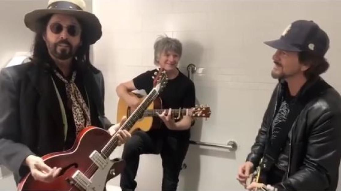 Mike Campbell chitarra ritmica dei Fleetwood Mac, Neil Finn leader dei Crowded House e Eddie Vedder hanno pensato bene di cimentarsi in una bellissima jam session in bagno!