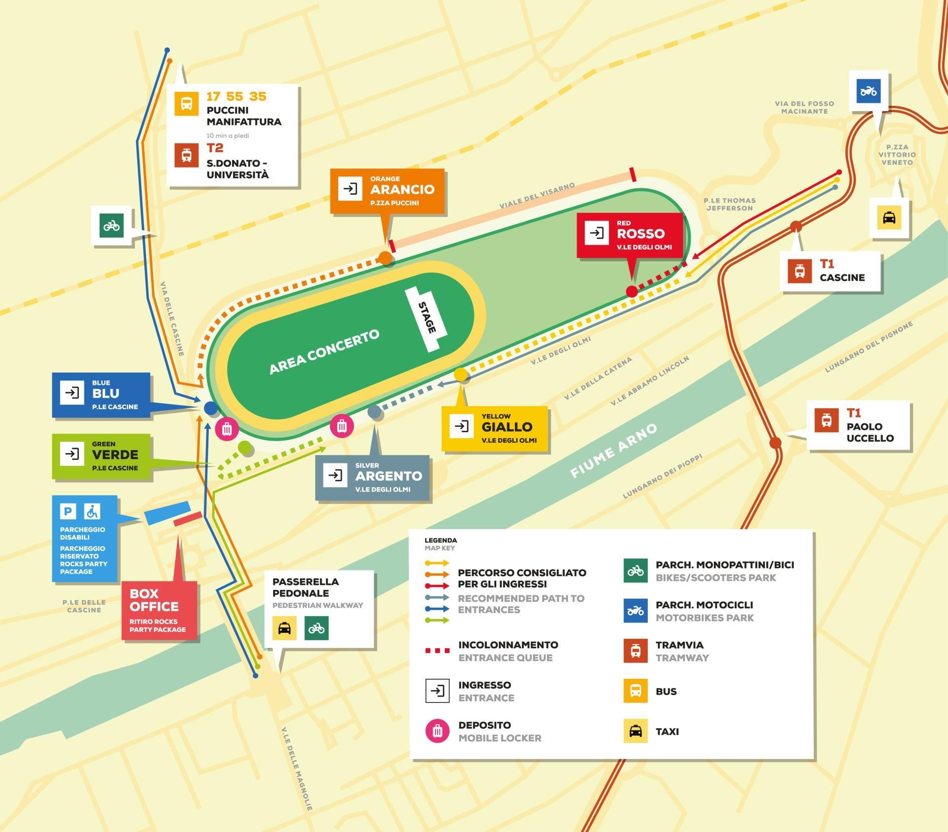 Se invece avrai il biglietto con l’ingresso Giallo, Verde e Argento, ti consigliamo di prendere la Linea 1 della tramvia e scendere alla fermata CASCINE (CARLO MONNI) posta in prossimità della Visarno Arena.