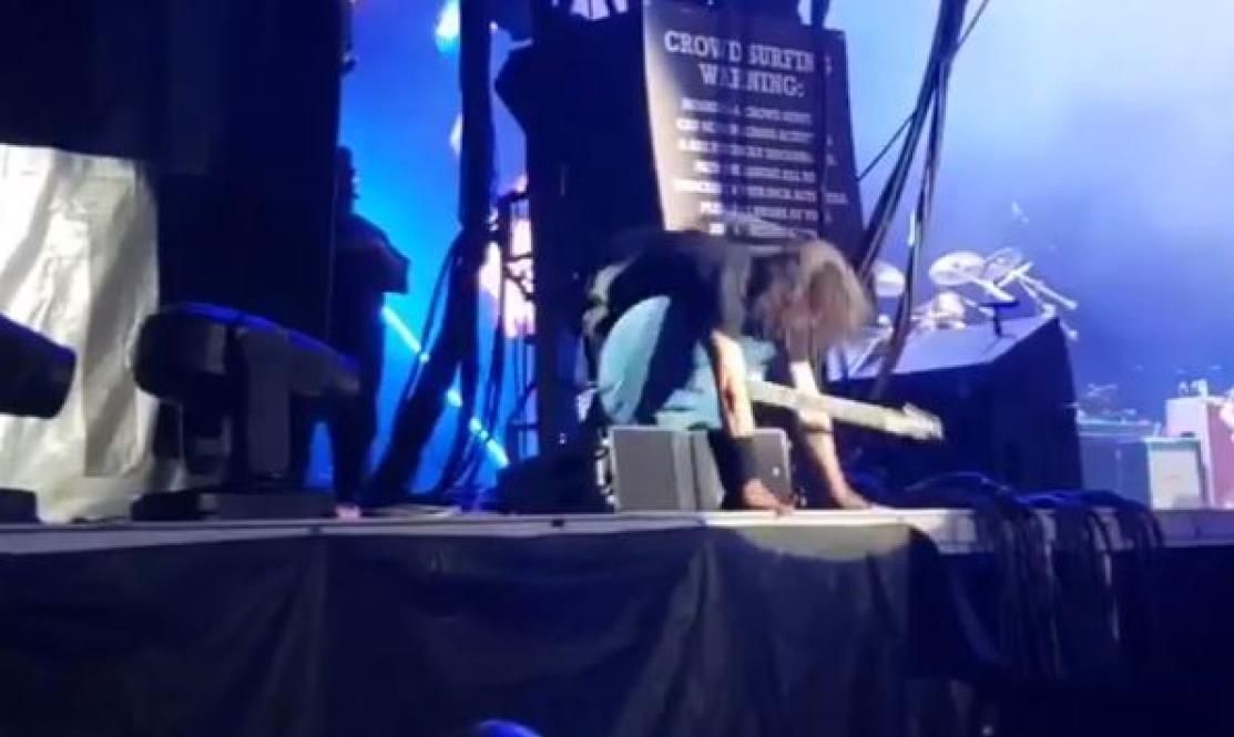 Il frontman dei Foo Fighters, durante uno show in Florida, è quasi caduto dal palco in una sequenza molto simile all’ormai leggendaria serata del 12 giugno 2015 a Stoccolma, quando cadendo dal palco si ruppe la gamba continuando però il concerto.