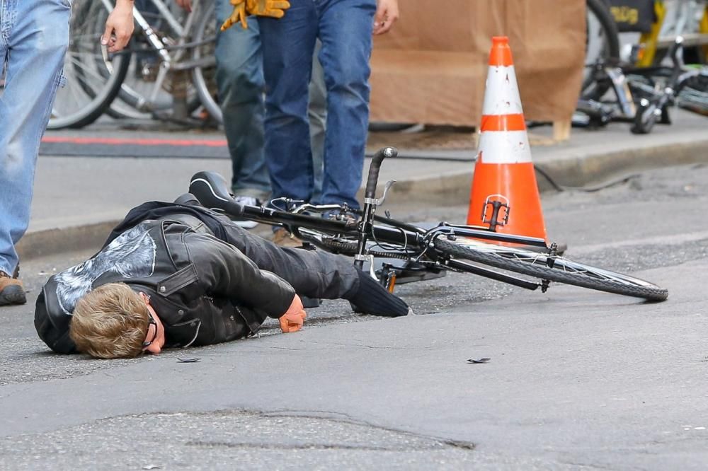 Il leader degli U2 in compagnia di Jimmy Fallon (e di uno stuntman) ha simulato la caduta dello scorso 17 novembre (Photo Corbis Images)