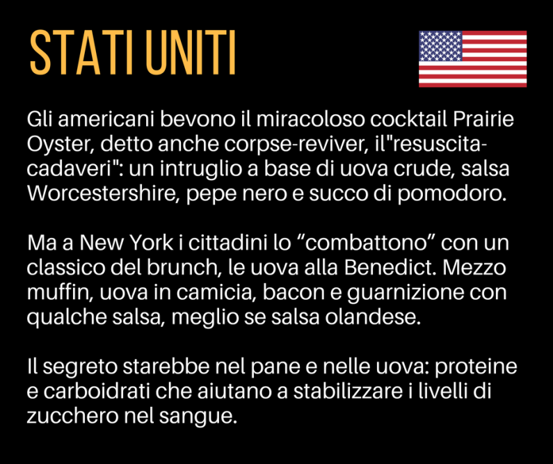 Gli americani bevono il miracoloso cocktail Prairie Oyster, detto anche corpse-reviver, il”resuscita-cadaveri”: un intruglio a base di uova crude, salsa Worcestershire, pepe nero e succo di pomodoro.