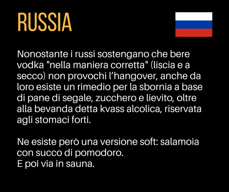Nonostante i russi sostengano che bere vodka “nella maniera corretta” (liscia e a secco) non provochi l’hangover, anche da loro esiste un rimedio per la sbornia a base di pane di segale, zucchero e lievito, oltre alla bevanda detta kvass alcolica, riservata agli stomaci forti. Ne esiste però una versione soft: salamoia con succo di pomodoro.