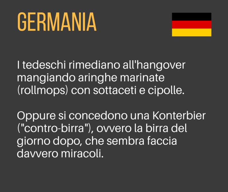 I tedeschi rimediano all’hangover mangiando aringhe marinate (rollmops) con sottaceti e cipolle. Oppure si concedono una Konterbier (“contro-birra”), ovvero la birra del giorno dopo, che sembra faccia davvero miracoli.