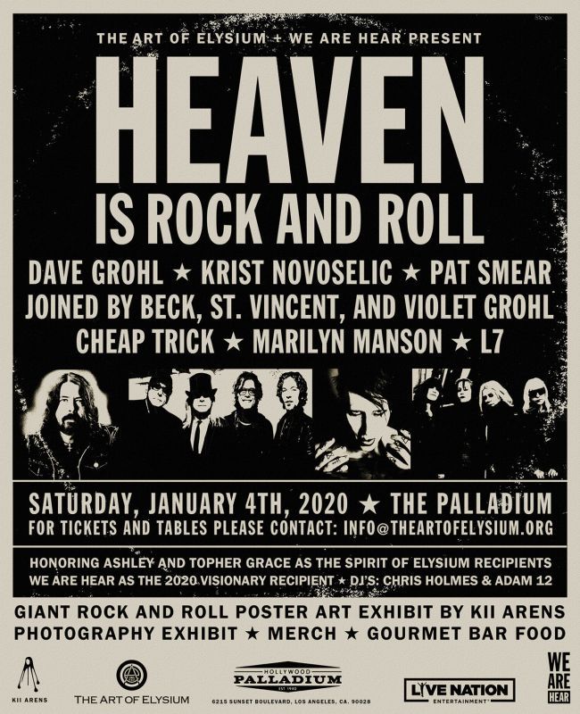 La band, composta da Dave Grohl, Krist Novoselic e Pat Smear, si è esibita in occasione della mostra benefica organizzata da The Art Of Elysium intitolata “Heaven Is Rock And Roll” suonando cinque classici della loro carriera. Grohl, Novoselic e Smear sono stati accompagnati sul palco da Violet Grohl,figlia tredicenne del batterista, St. Vincent e Beck.