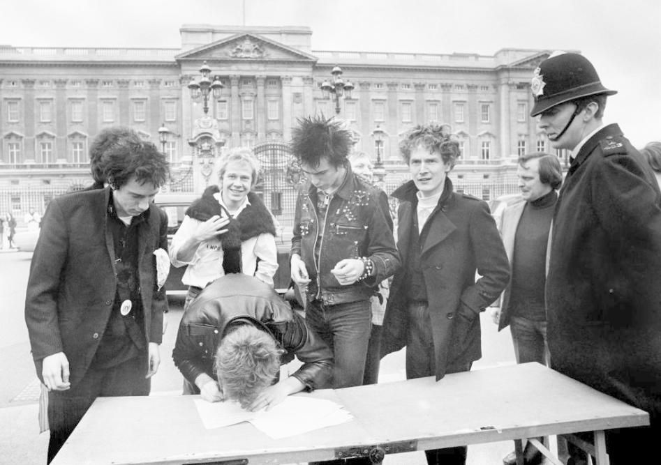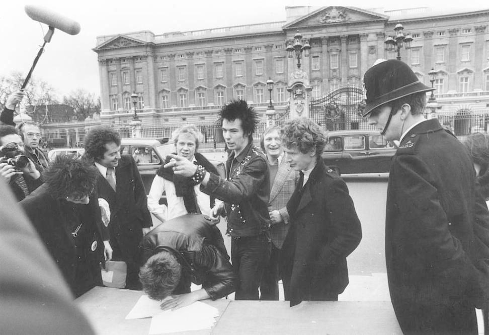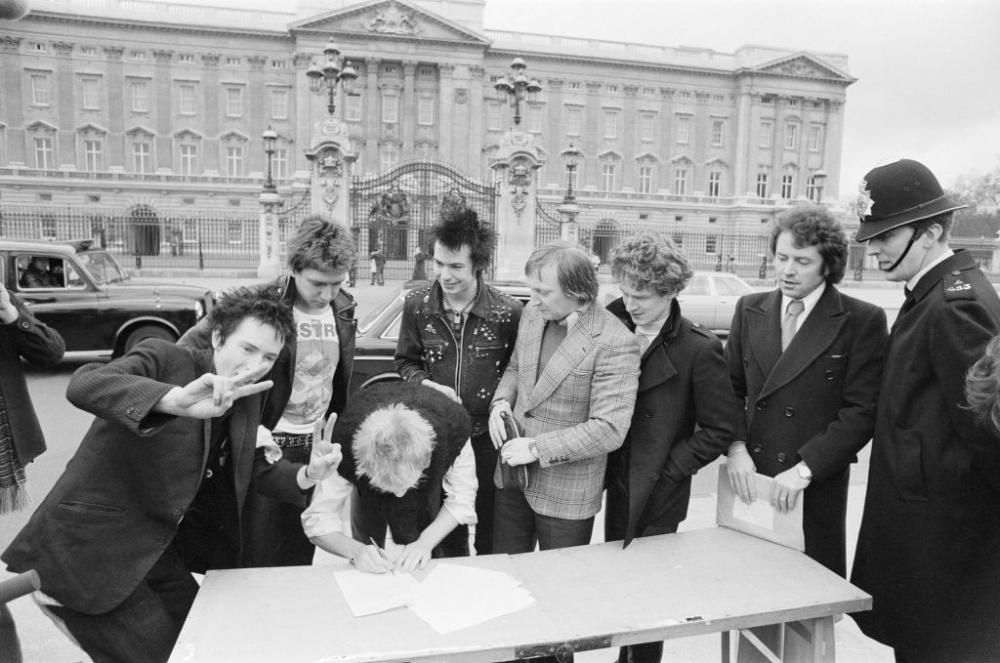 Le immagini della storica provocazione della band del 10 marzo del 1977 quando firmarono il contratto con la A&M Records fuori Buckingham Palace (Photo Getty Images)