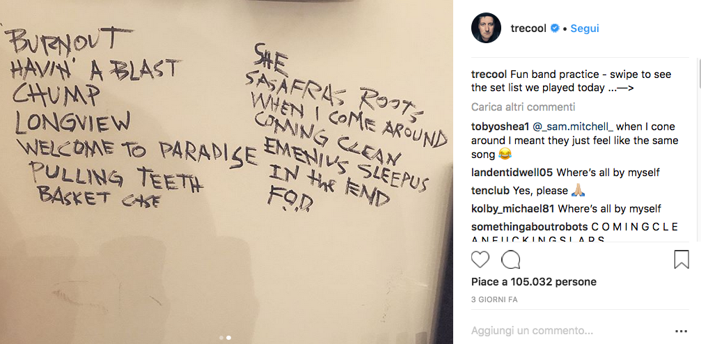 I Green Day stanno provando in studio tutte le canzoni di Dookie, il loro album del 1994, e questa potrebbe essere una gran bella notizia per i fan. La foto della scaletta prove pubblicata su Instagram da Tre Cool, il batterista, conteneva tutti brani di quel disco. Dookie, il primo vero classico della loro discografia (con brani come Longview, When I Come Around, Basket Case), l’anno prossimo compie venticinque anni, e la ricorrenza potrebbe essere un’ottima occasione per uno di quei tour celebrativi in cui una band porta in concerto un intero album della propria carriera, suonato dall’inizio alla fine in ordine di tracklist.