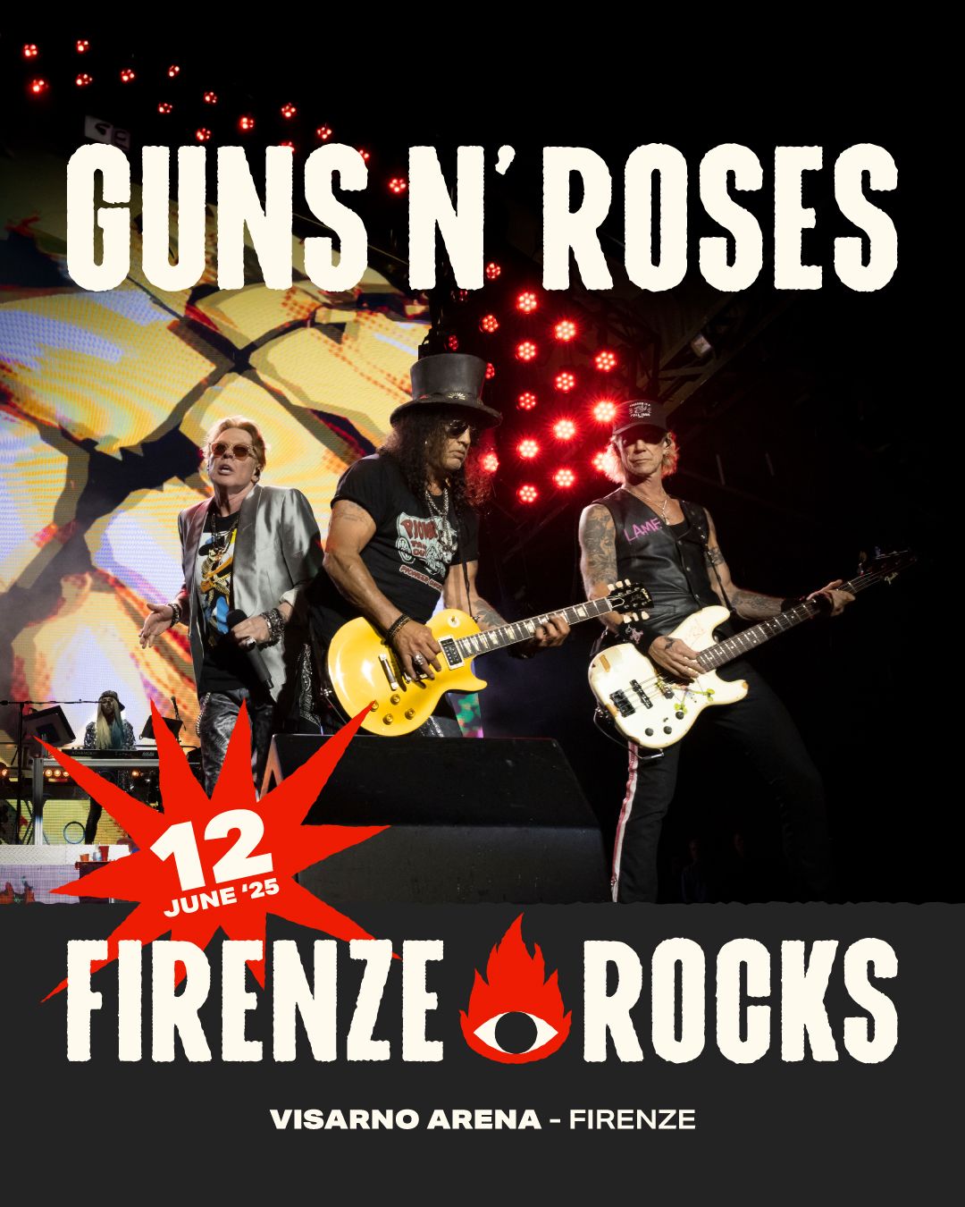 I Guns N’ Roses sono i secondi headliner annunciati per la prossima edizione di Firenze Rocks. I giganti della musica rock mondiale si esibiranno giovedì 12 giugno 2025 sul palco della Visarno Arena per la loro unica tappa italiana del tour Guns N’ Roses: Because What You Want & What You Get Are Two Completely Different Things. Nella stessa giornata i Rival Sons saliranno sul palco prima dei Guns N’ Roses.