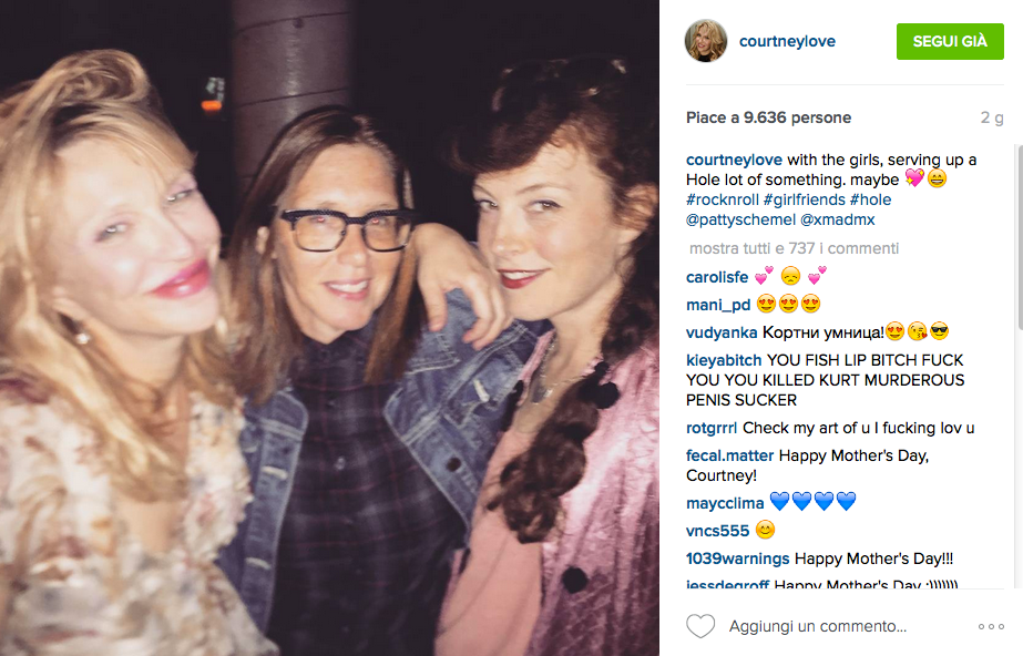 Courtney Love ha lanciato indizi sull’ormai probabile reunion delle Hole. Su Instagram infatti l’ex moglie di Kurt Cobain ha pubblicato una foto che la ritrae in compagnia di due membri originali della band: la bassista Melissa Auf Der Maur e la batterista Patty Schemel e con la didascalia: “Con le ragazze, pensando a qualcosa delle Hole. Forse”. Nella foto non figura il quarto membro della band Eric Erlandson che però è stato inserito da Courtney nel tag dell’immagine. Si parla ormai da più di due anni di una possibile reunion delle Hole ma i tanti indizi per il momento non hanno portato a nulla di concreto. Ora però potrebbe essere il momento giusto per il ritorno.