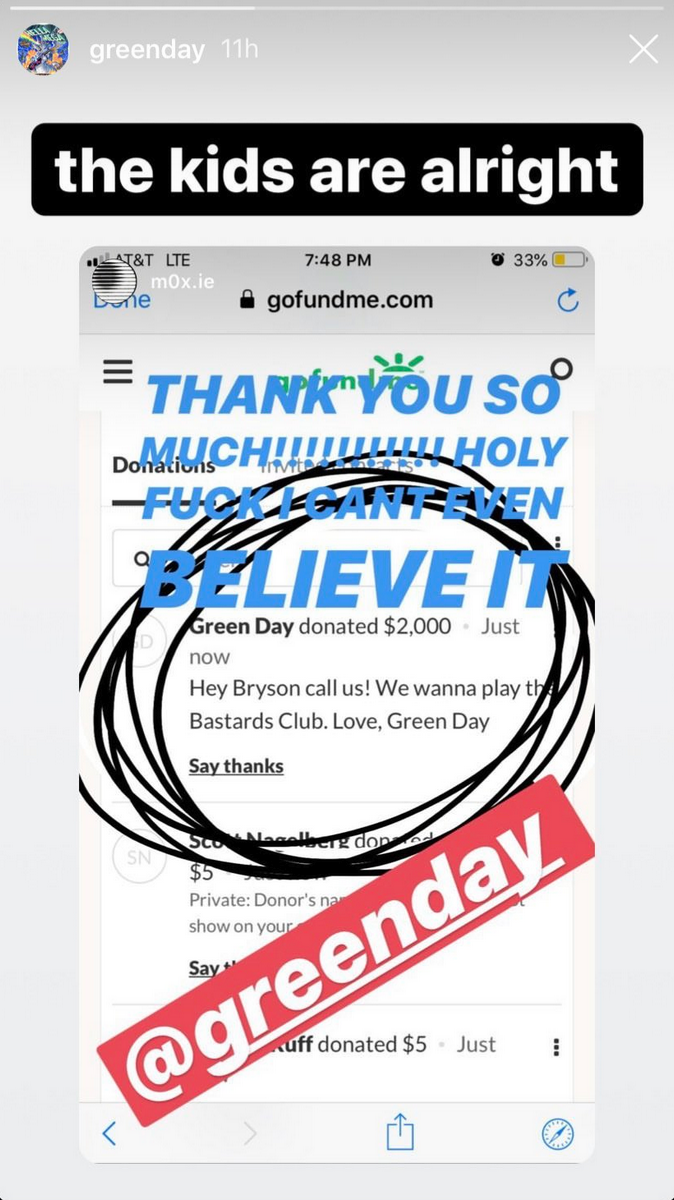 La storia del diciassettenne è diventata virale, tanto da avviare una raccolta fondi alla quale hanno partecipato anche i Green Day. La band ha inviato un messaggio al ragazzo: “Ehi Bryson chiamaci! Vogliamo suonare per il Bastards Club (nome della società di Del Valle che si occupa organizzare concerti). Love, Green Day”. Il gruppo ha poi pubblicato la ricevuta del pagamento in una story del suo profilo Instagram, scrivendo: “I ragazzi stanno bene”.
