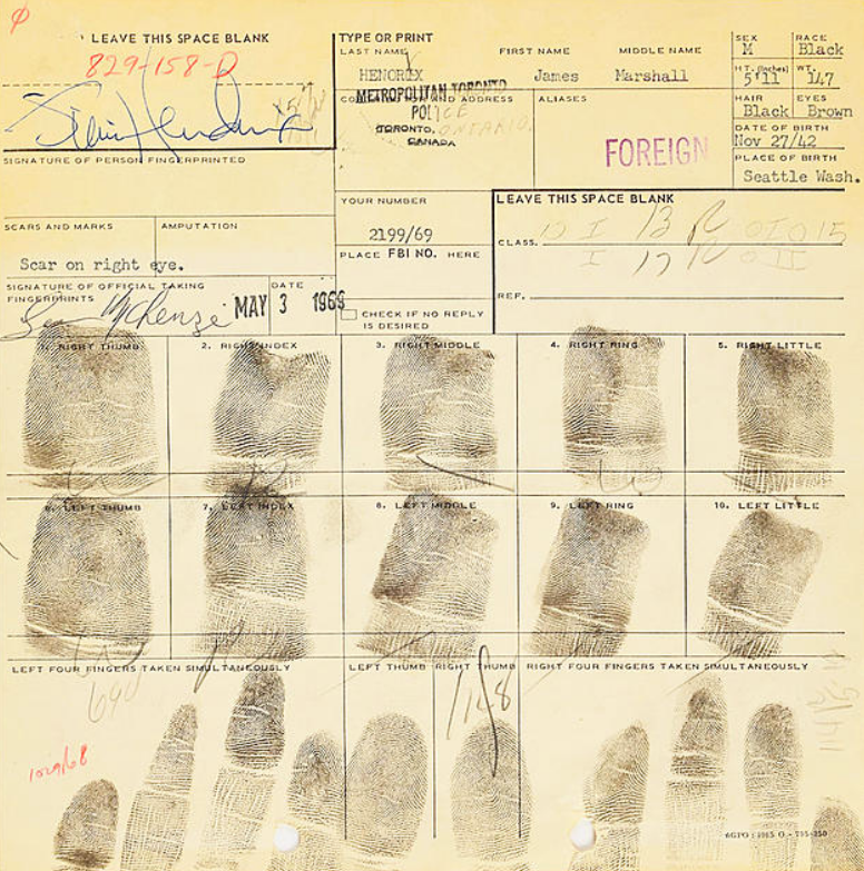 Quando sei una star musicale a livello mondiale hai il potere di far sì che tutto ciò che tocchi acquisti un valore inestimabile. Persino gli oggetti più impensabili, come una carta d’arresto. Parliamo del documento compilato in Canada da Jimi Hendrix, a seguito dell’accusa di possesso di droga, il 3 maggio del 1969.