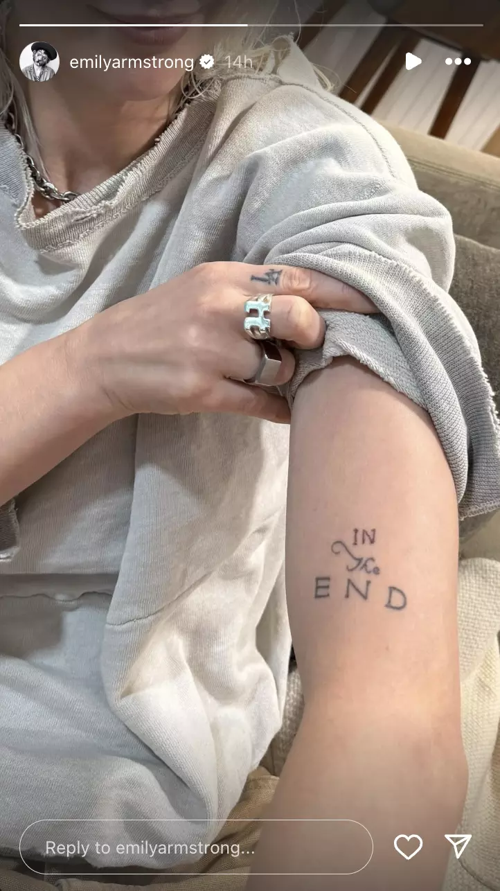 Emily Armstrong ha mostrato in un video su Instagram la sua totale immersione nel mondo dei Linkin Park, di cui è diventata la nuova cantante. Sul braccio sinistro aveva già un tatuaggio con scritto “The End” a cui ha aggiunto “In”, componendo così il titolo della canzone più famosa della band, In the End. È il quarto e ultimo singolo estratto dall’album di debutto Hybrid Theory, esce il 9 ottobre 2001 e arriva al numero due in classifica in America e negli anni diventa la prima canzone nu metal a superare il miliardo di stream su Spotify.