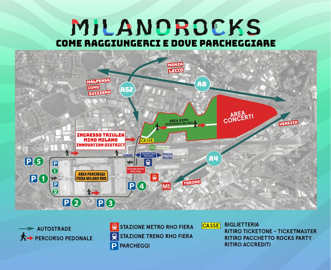 L’ingresso all’area concerti (ACCESSO OVEST TRIULZA) si trova vicino alla fermata RHO FIERA M1 (LINEA ROSSA) – NECESSARIO TICKET ATM VALIDO PER RHO FIERA.