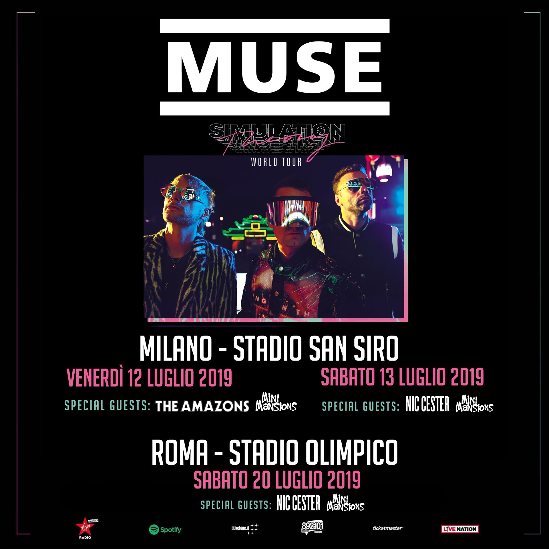 Dopo le prime date in Europa e il grandissimo successo della parte britannica del loro nuovo tour mondiale, i MUSE saranno in Italia con tre show nei due più grandi e prestigiosi stadi italiani, rispettivamente venerdì 12 e sabato 13 luglio a Milano e sabato 20 luglio a Roma, per presentare il loro ultimo album “Simulation Theory”, il concept in cui le macchine hanno preso il sopravvento sugli uomini.