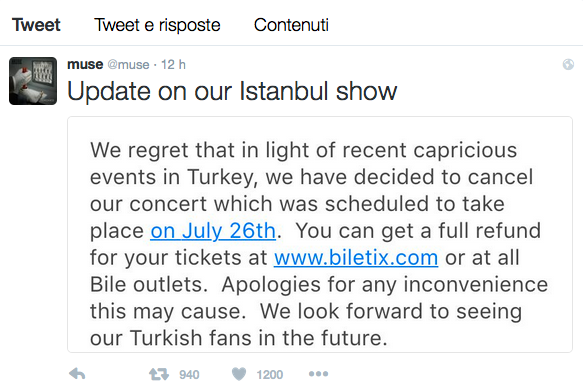 I Muse hanno deciso di cancellare il concerto in programma ad Istanbul, in Turchia dopo il recente tentativo di colpo di stato. La situazione all’interno del paese è ancora molto tesa e la band ha preferito rinunciare ad una situazione rischiosa. L’annuncio è arrivato proprio dalla pagine Twitter dei Muse che hanno anche comunicato che tutti i biglietti verranno rimborsati: “Ci dispiace che alla luce dei recenti eventi in Turchia siamo costretti a cancellare al nostro concerto in programma il prossimo 26 luglio. Ci scusiamo per ogni inconveniente che questo può causare e ci auguriamo di poter tornare a suonare in Turchia in futuro”.