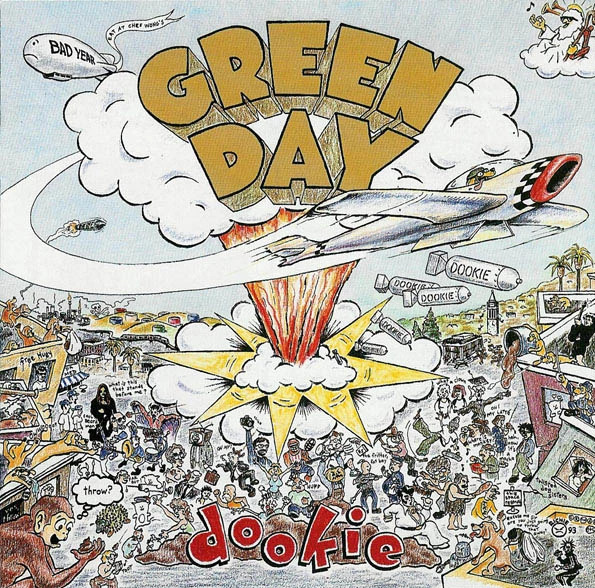 Anche la copertina di Dookie è una dichiarazione: i Green Day mettono insieme la passione per il punk, i fumetti e l’umorismo dissacrante (il titolo è un termine dello slang californiano per indicare i bisogni corporali, all’inizio volevano intitolarlo addirittura Liquid Dookie) e creano insieme all’artista Richie Bucher che fa parte della loro stessa scena della East Bay una copertina in cui il loro nome esplode in mezzo ad una strada del centro di Berkeley, Telegraph Avenue in mezzo ad una serie di luoghi, personaggi e icone: gli amici di Berkeley, diverse scimmie, un cane che pilota l’aereo che sgancia la bombia, Angus Young degli Ac Dc, il fondatore delle Black Panthers Huey P.Newton, la Sather Tower della Unversity of California, Patti Smith sulla copertina di Easter, l’inquietante figura spettrale sulla copertina del primo album dei Black Sabbath e i pozzi di petrolio di Rodeo in California, un Elvis Presley a fine carriera e un omaggio a Rocket to Russia dei Ramones. «Volevamo che fosse un copertina diversa, che rappresentasse davvero il mondo della East Bay dal quale arrivavamo, in cui gli artisti sono importanti come la musica» ha detto Billie Joe Armstrong.