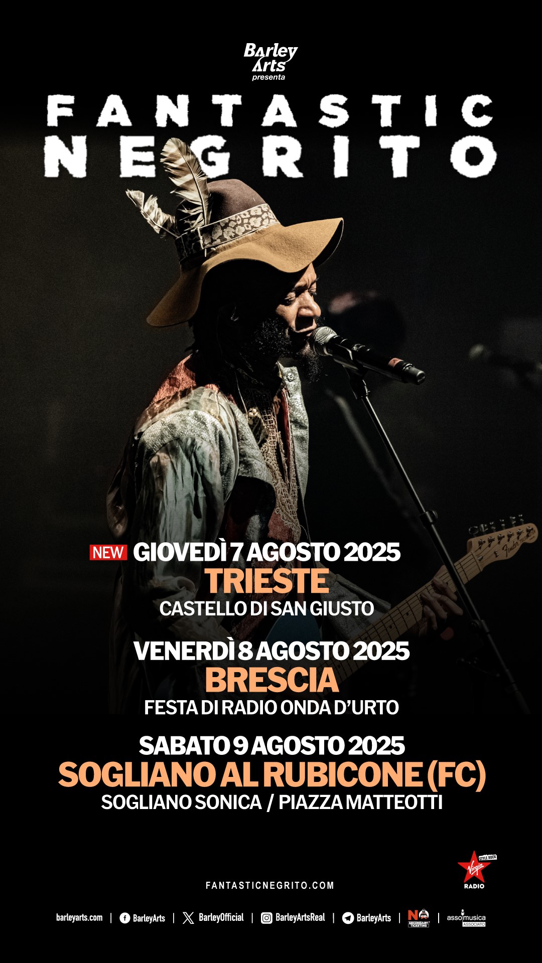 Fantastic Negrito continua a dimostrare una certa predilezione per l’Italia e aggiunge una tappa al suo minitour estivo già annunciato. A precedere le tappe di venerdì 8 agosto 2025 alla Festa di Radio Onda d’Urto a Brescia e sabato 9 agosto all’interno della rassegna Sogliano Sonica di Sogliano al Rubicone (FC), ci sarà uno stop al Castello di San Giusto di Trieste giovedì 7 agosto. I biglietti per questo nuovo show saranno disponibili su Ticketone, Eilo ed Eventim.si dalle 10 di giovedì 20 febbraio; la tappa di Brescia sarà ad ingresso gratuito fino alle 20 del giorno del concerto (a seguire il biglietto costerà € 10 in cassa), mentre i biglietti per quella di Sogliano al Rubicone sono già disponibili su Ticketone.