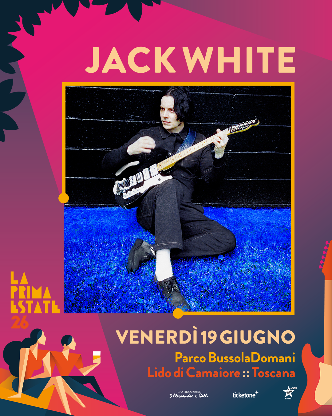 Per Jack White – i biglietti saranno in vendita su TicketOne dalle ore 11 di martedì 25 novembre - è la prima esibizione italiana da solista, un’occasione imperdibile in uno degli scenari più suggestivi dell’estate: un palco unico a pochi passi dal mare, affacciato sul Tirreno e abbracciato dalle Alpi Apuane nella luminosa cornice della Versilia.