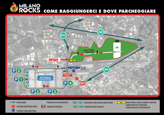 L’ingresso all’area concerti Accesso Ovest Triulza si trova vicino alla fermata Rho-Fiera M1 (linea rossa) - necessario ticket ATM valido per Rho Fiera.