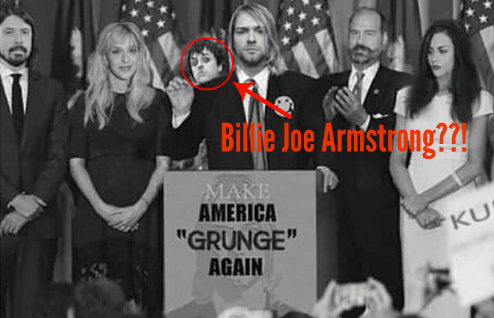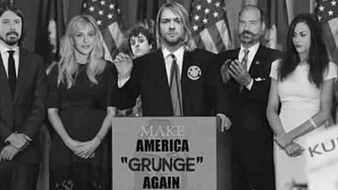 Partendo da sinistra vediamo Dave Grohl, Courney Love, Kurt Cobain, Krist Novoselić e Francis Bean Cobain su un palco presidenziale decisamente particolare. E fin qui tutto bene, ma non trovate che ci sia “qualcuno” di insolito dietro ai protagonisti in primo piano?