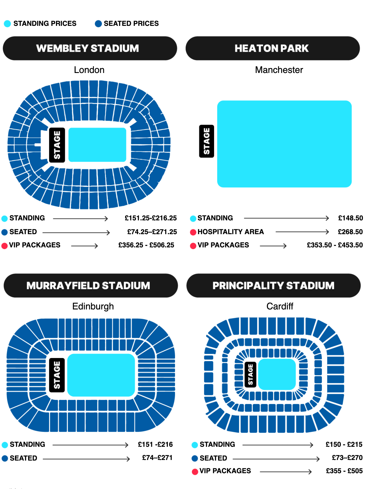 La stampa britannica ha pubblicato i prezzi dei biglietti per assistere al Reunion Tour degli Oasis. Chi riuscirà a fare propri i biglietti per uno dei live previsti a Londra, Manchester, Cardiff, Edimburgo o Dublino dovrà spendere come minimo di 74 sterline (87 euro circa a cui vanno aggiunti i diritti di prevendita) per un posto seduto fino ad arrivare a oltre le 500 sterline (più di 600 euro) per i VIP Packages. I biglietti per i live a Dublino partiranno dagli 86 euro più diritti di prevendita.