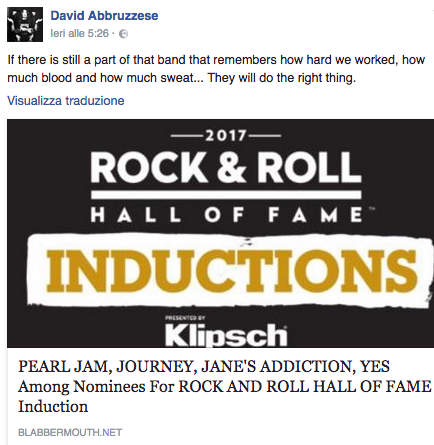Nella giornata di ieri è stata rivelata la “nomination” dei Pearl Jam per entrare a far parte della classe 2017 della Rock and Roll Hall of Fame. Ma sul profilo della band non risulta il nome di Dave Abbruzzese. Il batterista ha lasciato il gruppo nel 1994 con forti dissapori con il resto della band, e dopo anni di silenzio è stata la notizia a riportare a galla vecchi rancori. Sulla sua pagina Facebook, Abbruzzese ha subito commentato la notizia: “I membri dei Pearl Jam devono sapere qual è la cosa giusta da fare. Non possono giustificare il fatto che viene ignorato il mio contributo, che io gli piaccia o no. Se c’è anche una parte di quella band che si ricorda quanto abbiamo lavorato duro, quanto sangue e sudore abbiamo dato, allora faranno la cosa giusta”. Il batterista ha sostituito nel 1991 Dave Krusen, prendendo parte agli album “Vs.” e “Vitalogy” prima di lasciare il gruppo.