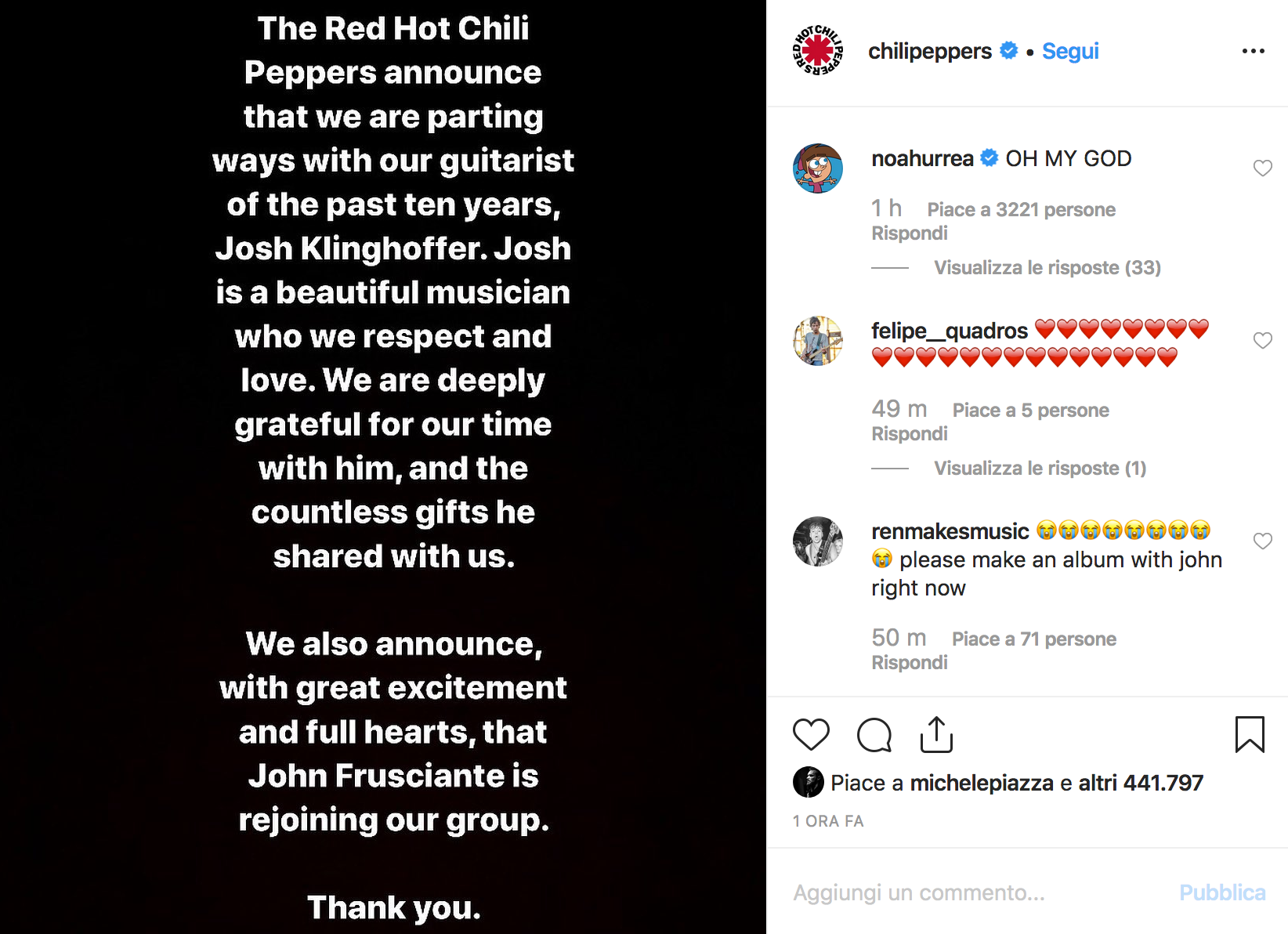 I Red Hot Chili Peppers, attraverso un post pubblicato sul loro profilo Instagram hanno annunciato che John Frusciante è rientrato nel gruppo. Allo stesso tempo hanno ringraziato Josh Klinghoffer per i suoi dieci anni nella band. Per Frusciante si tratta dell’ennesimo ritorno dopo aver fatto parte del gruppo dal 1988-1992 e dal 1998-2009.