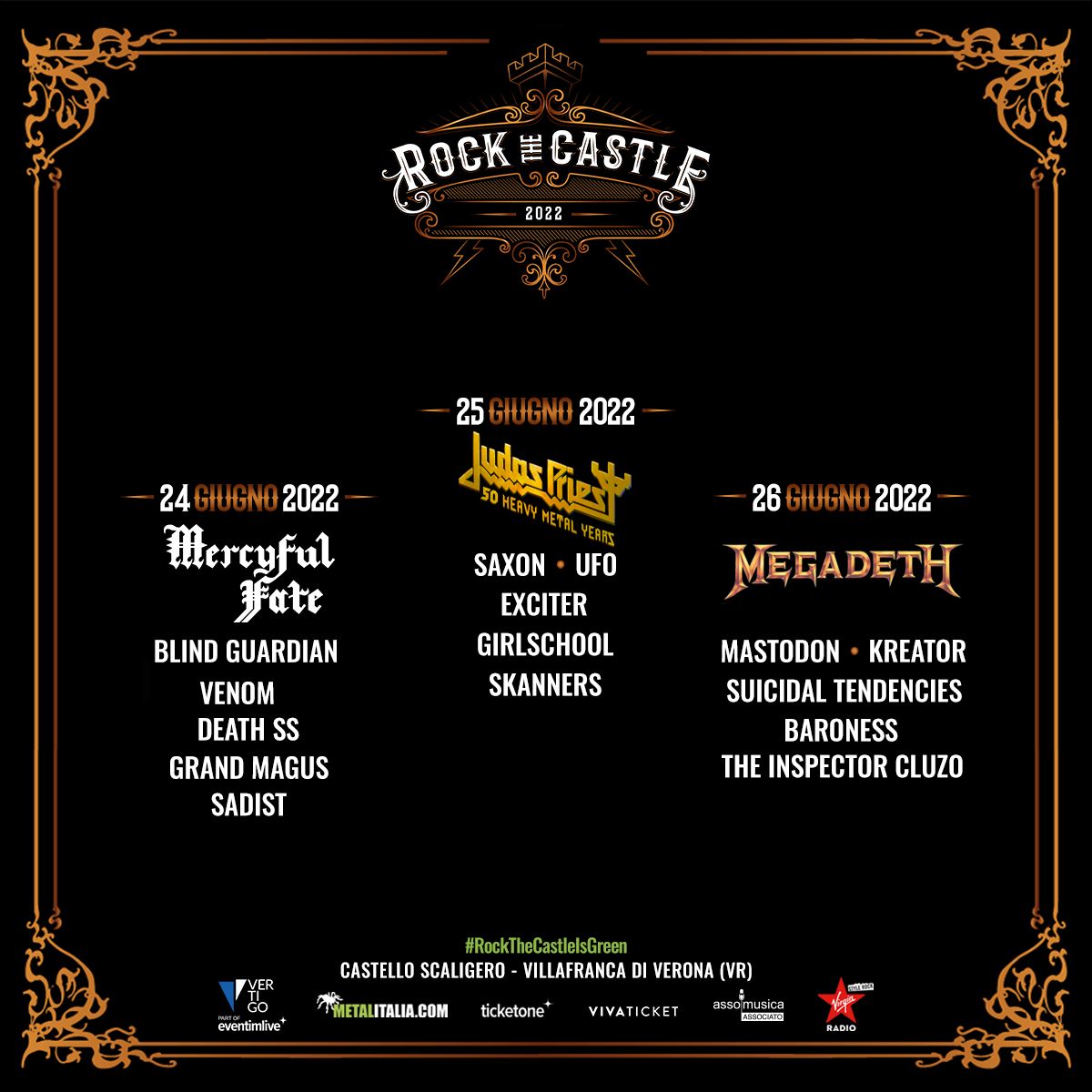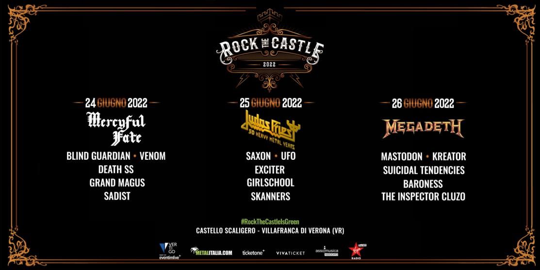 Le giornate del 24, 25 e 26 giugno di ROCK THE CASTLE 2022 rimangono confermate come da programma, si svolgeranno al Castello Scaligero di Villafranca di Verona e vedranno sul palco come headliner MERCYFUL FATE, JUDAS PRIEST e MEGADETH.