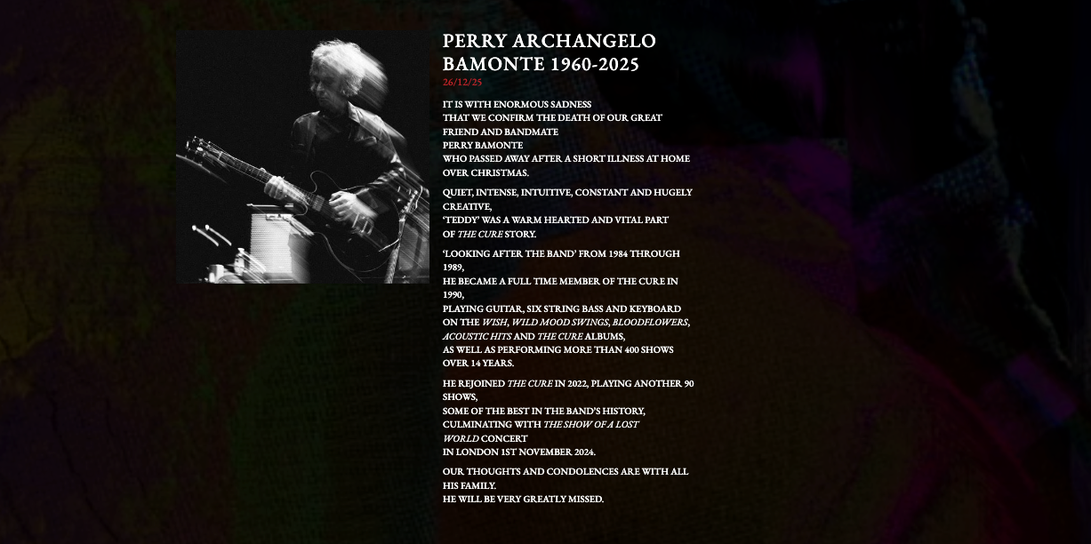 “È con grande tristezza che annunciamo la morte del nostro grande amico e compagno di band Perry Bamonte, che è venuto a mancare a casa dopo una breve malattia. Silenzioso, intenso, intuitivo, costante ed estremamente creativo, è stato una parte vitale della storia dei Cure. I nostri pensieri e le nostre condoglianze vanno alla sua famiglia. Ci mancherà molto”.